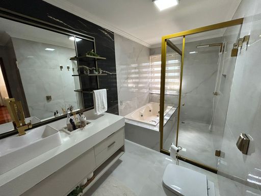 No primeiro pavimento é onde encontra-se a sala de estar, sala de jantar, jardim de inverno, cozinha, quarto de hóspedes, banheiro social, escritório, lavanderia, despensa e garagem fechada para dois carros.