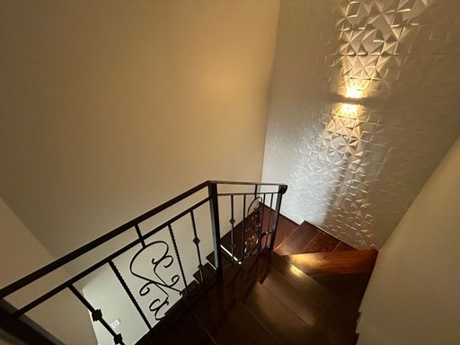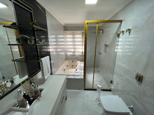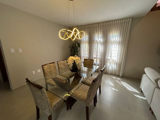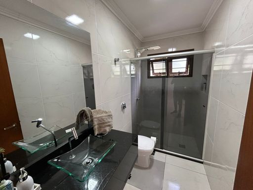 No pavimento superior ficam localizados três quartos, sendo um deles a suíte master com banheiro e closet; e mais banheiro social além de um amplo living.